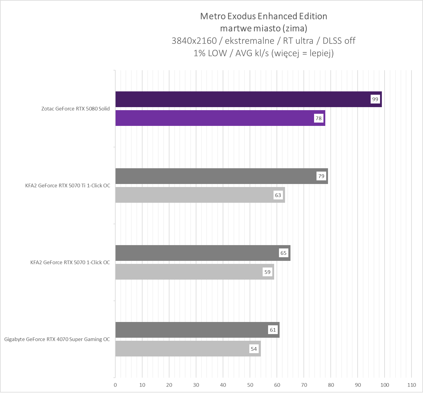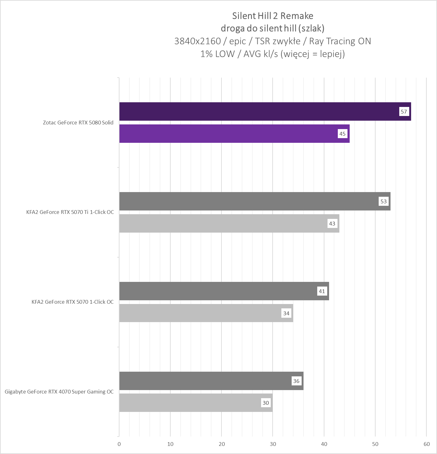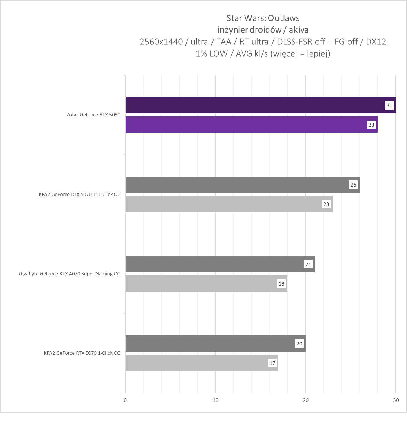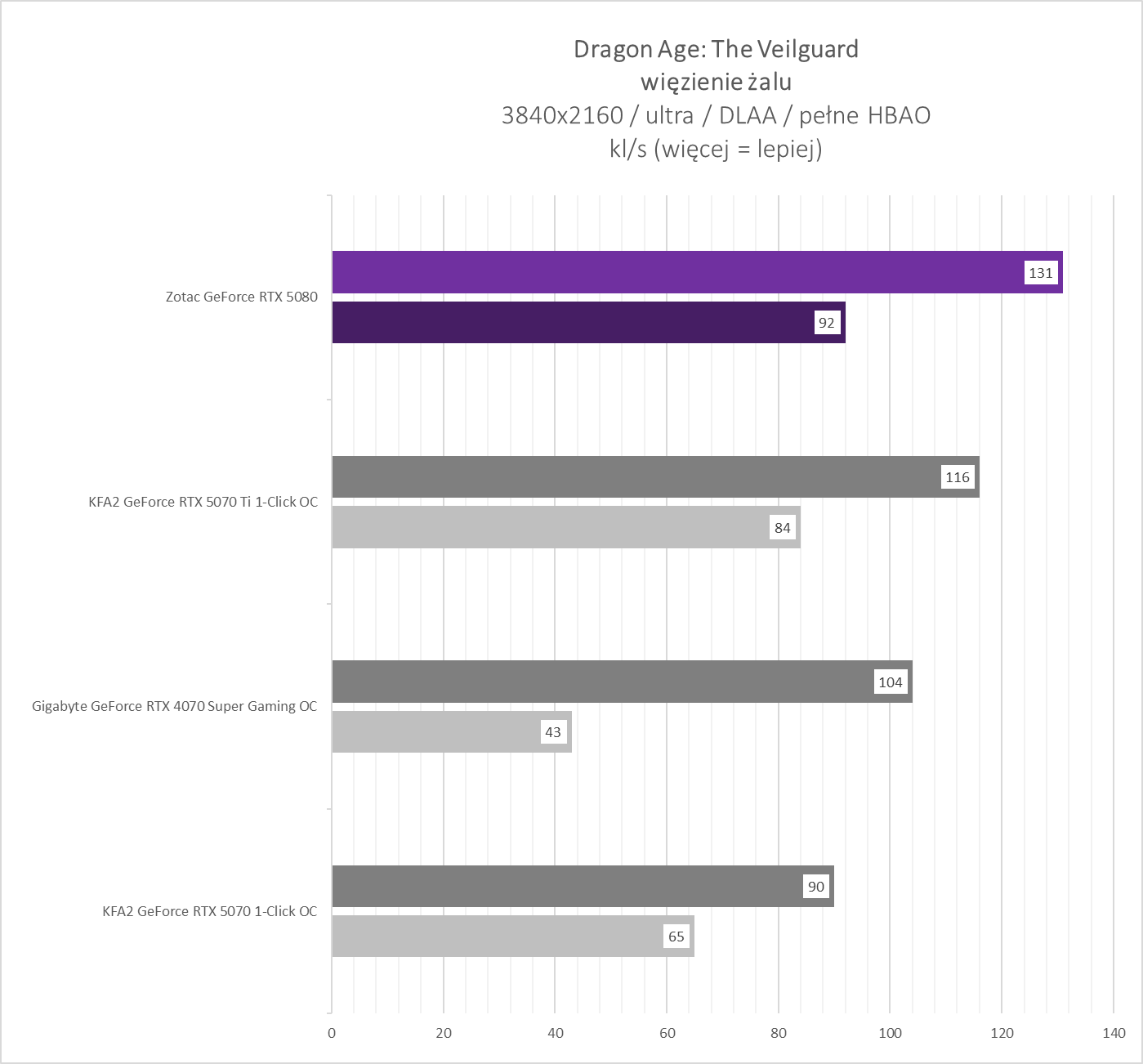 Testy karty graficznej przeprowadzono na systemie Windows 11 64-bit (wersja 23H2) z użyciem sterowników nVidia 576.02, w trakcie rzeczywistej rozgrywki. Do pomiaru liczby klatek wykorzystałem program CapeFrameX w wersji 1.7.2.