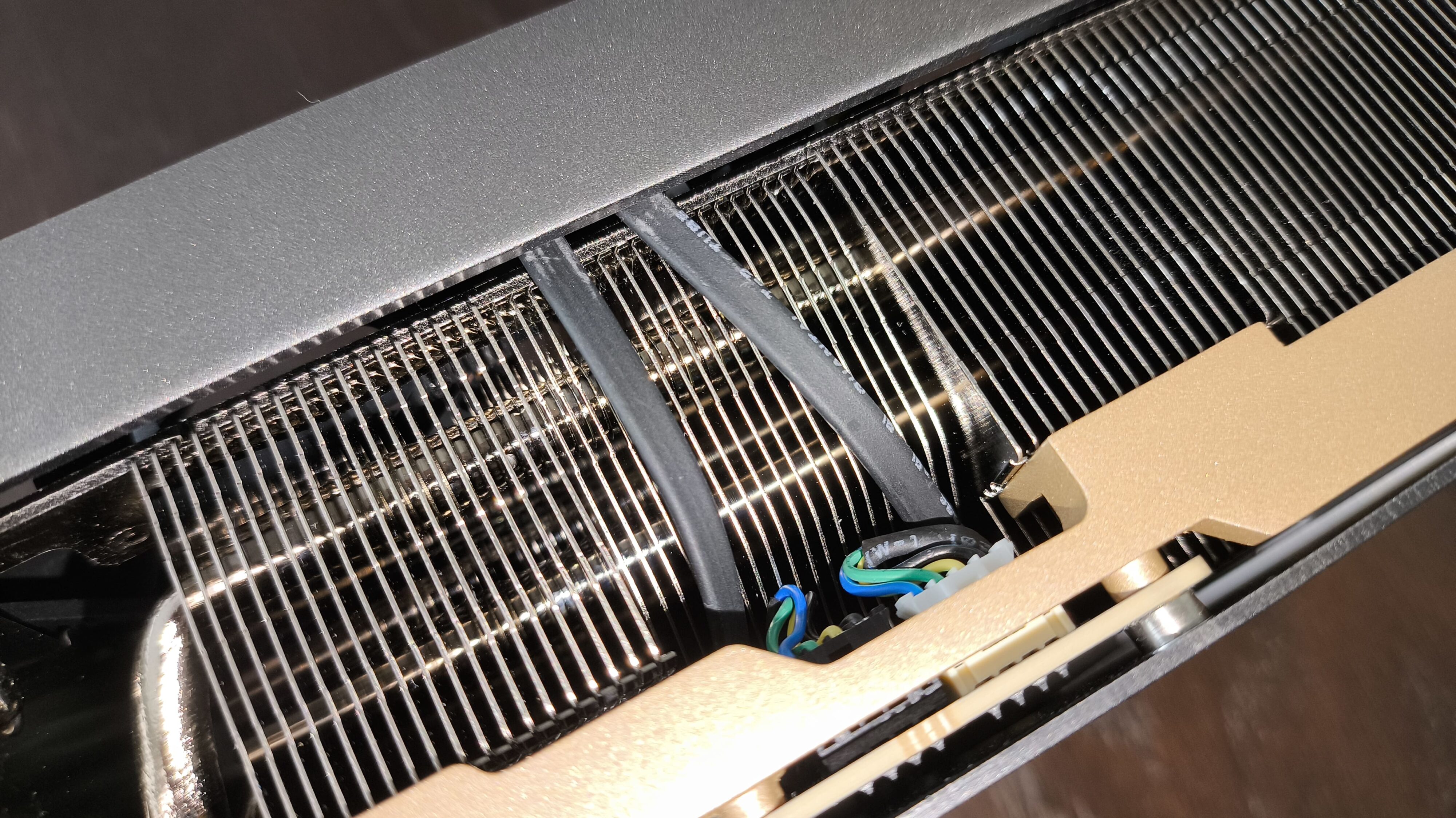 Zamontowane wentylatory BladeLink mają średnicę 100 mm i zostały wyposażone w pierścienie na obwodzie, które mają za zadanie lepiej ukierunkować strumień powietrza. Dwa pierwsze wentylatory wtłaczają powietrze bezpośrednio na PCB w tradycyjny sposób, natomiast trzeci odpowiada częściowo za wypychanie powietrza przez tył karty, wspierając wentylację całego układu chłodzenia.