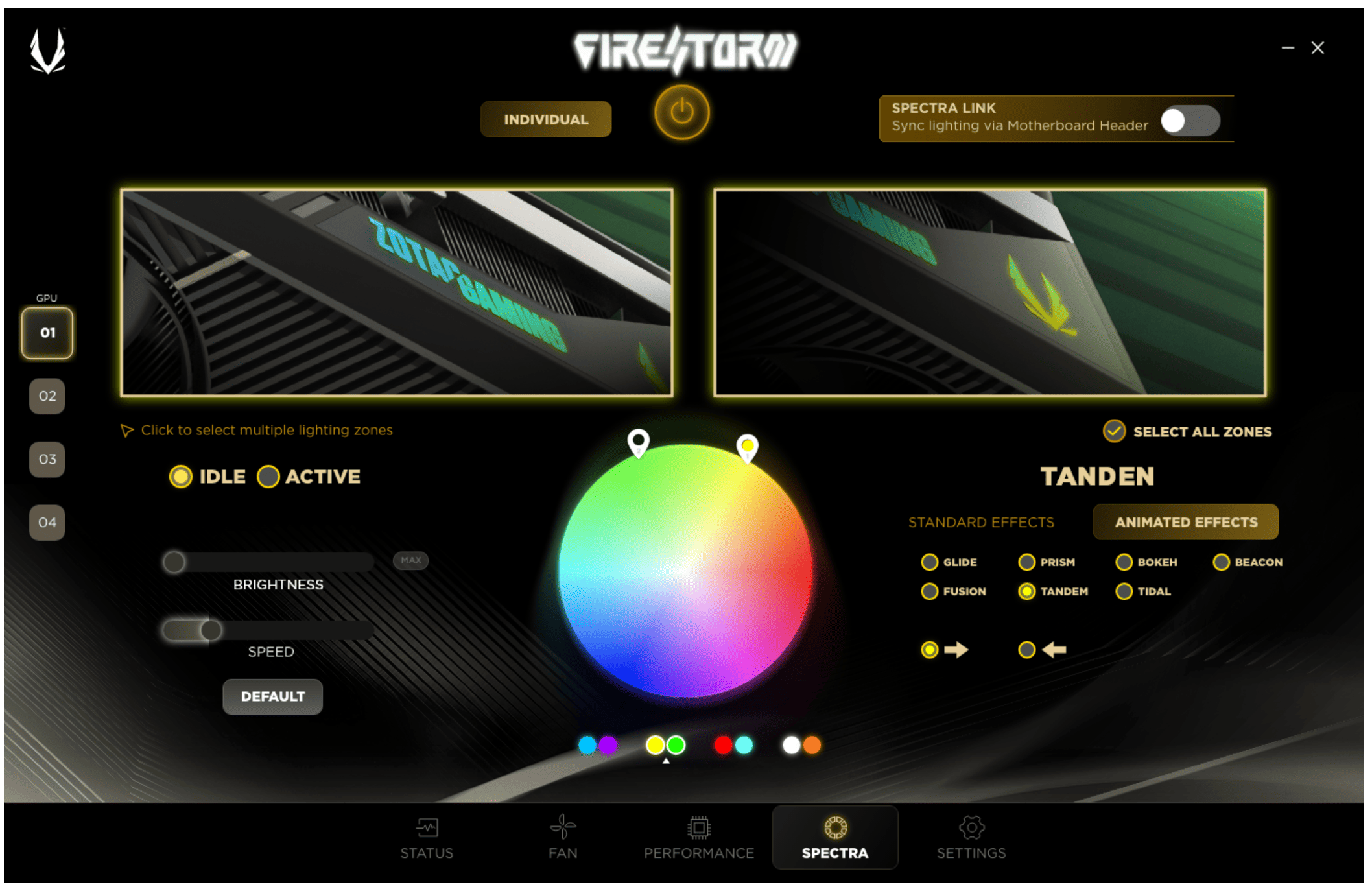 Zotac SPECTRA to oprogramowanie pozwalające na kontrolę podświetlenia RGB, które ujrzało światło dzienne już kilka lat temu. Działa ono ze sprzętem ZOTAC i pozwala na zmianę ustawień podświetlenia RGB, które można znaleźć w wybranych produktach ZOTAC.