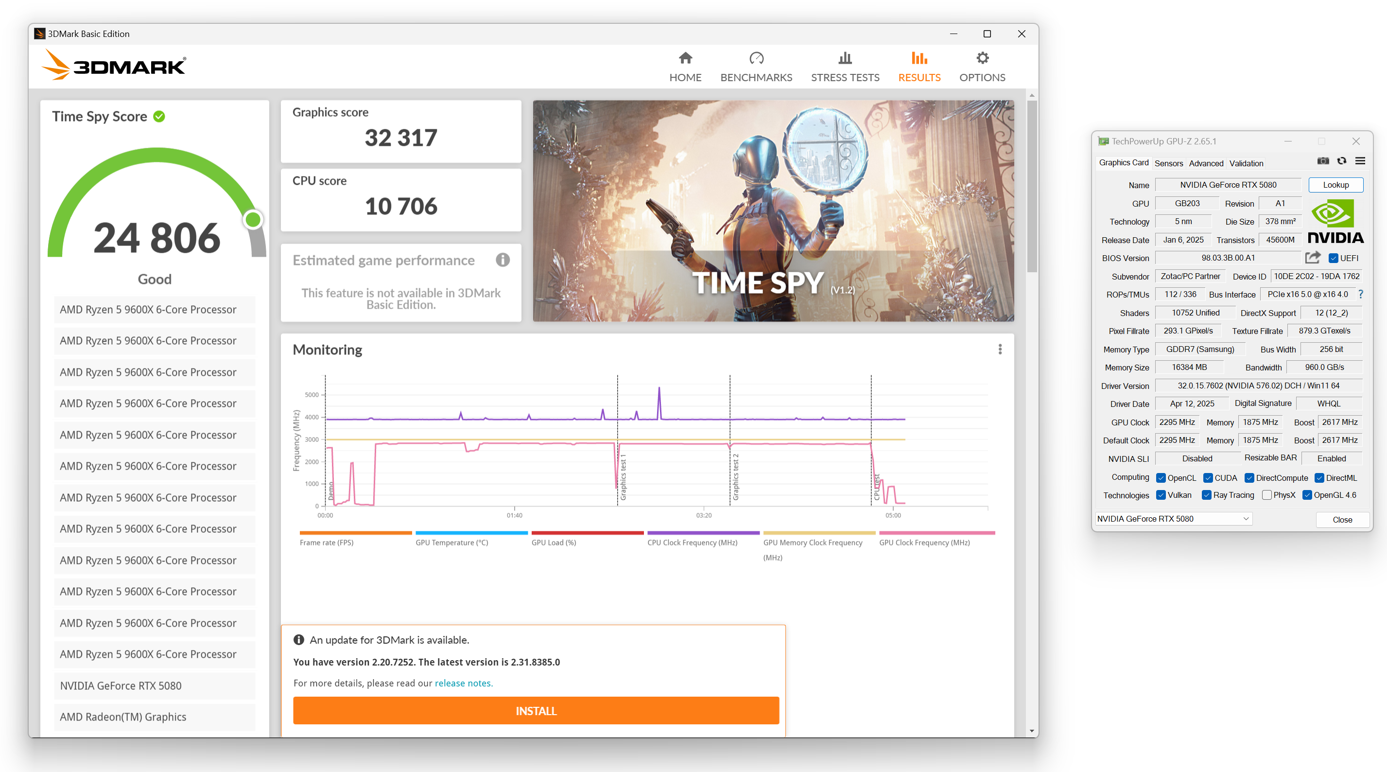 Wydajność karty graficznej stoi na bardzo wysokim poziomie, choć należy wspomnieć o pewnych widocznych odstępstwach, które wynikają głównie z zastosowanego podczas testów procesora – tj. AMD Ryzen 5 9600X (a nie mam zamiaru go zmieniać na tę chwilę, bo mój komputer służy do „wszystkiego” – to nie jest ściśle złożona konfiguracja tylko pod testy GPU).