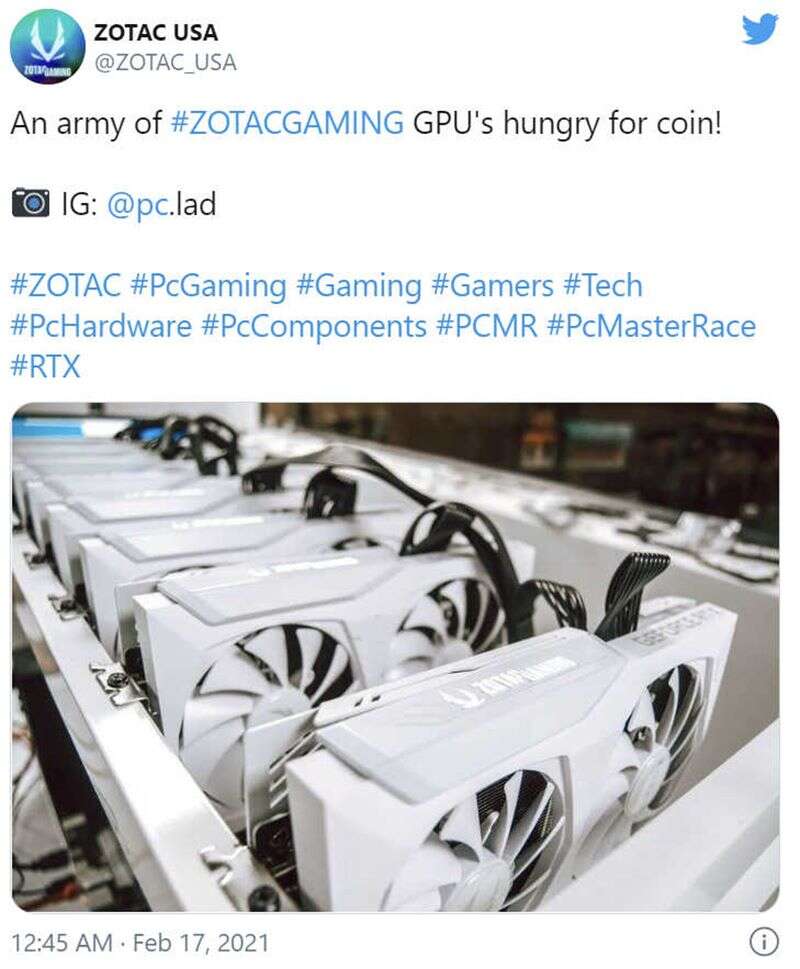 Wszystko sprowadza się do już usuniętego wpisu na Twitterze z 17 lutego, który to dumnie ogłosił na oficjalnym fanpage firmy w USA, jak karty ZOTAC świetnie radzą sobie w koparkach kryptowalut. Nie jest to najlepszy ruch ze strony producenta, którego karty są na rynku kompletnie niedostępne, a jeśli już, to w szalenie wysokich cenach.
